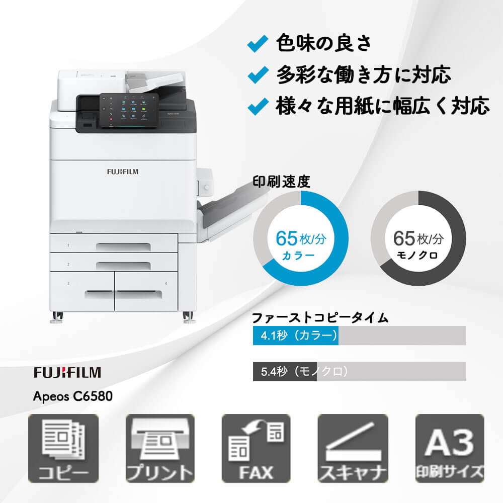 Apeos C6580は、品質と耐久性に定評のある富士フイルムのハイエンドモデルです。