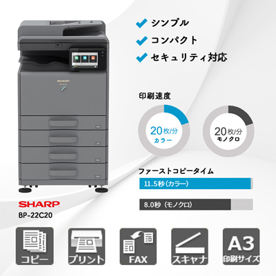 BP-22C20は、小規模オフィス向けのコスパモデルで、月間1,000〜2,000枚程度の利用に適しています。上位モデルと比べて、オプションによる拡張性が限られるものの、必要十分な機能に絞り込むことで本体価格を抑えている点が魅力です。