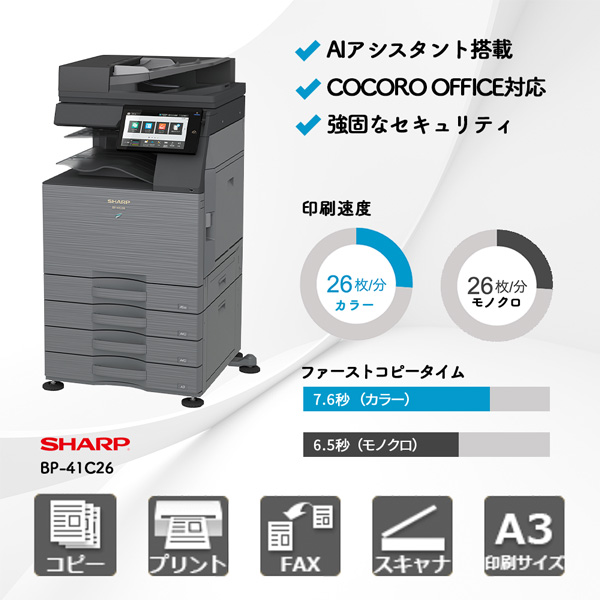 BP-41C26は、AIの導入で操作性を高めながらも、導入コストを抑えたシャープのコスパモデルです。生成AIアシスタント「eAssistant Guide」が搭載されており、操作の疑問をチャット形式で質問できるため、操作に不慣れな方でもスムーズに操作できます。さらに、OneDriveやGoogle Driveなど多彩なクラウドサービスへの直接保存にも対応しています。