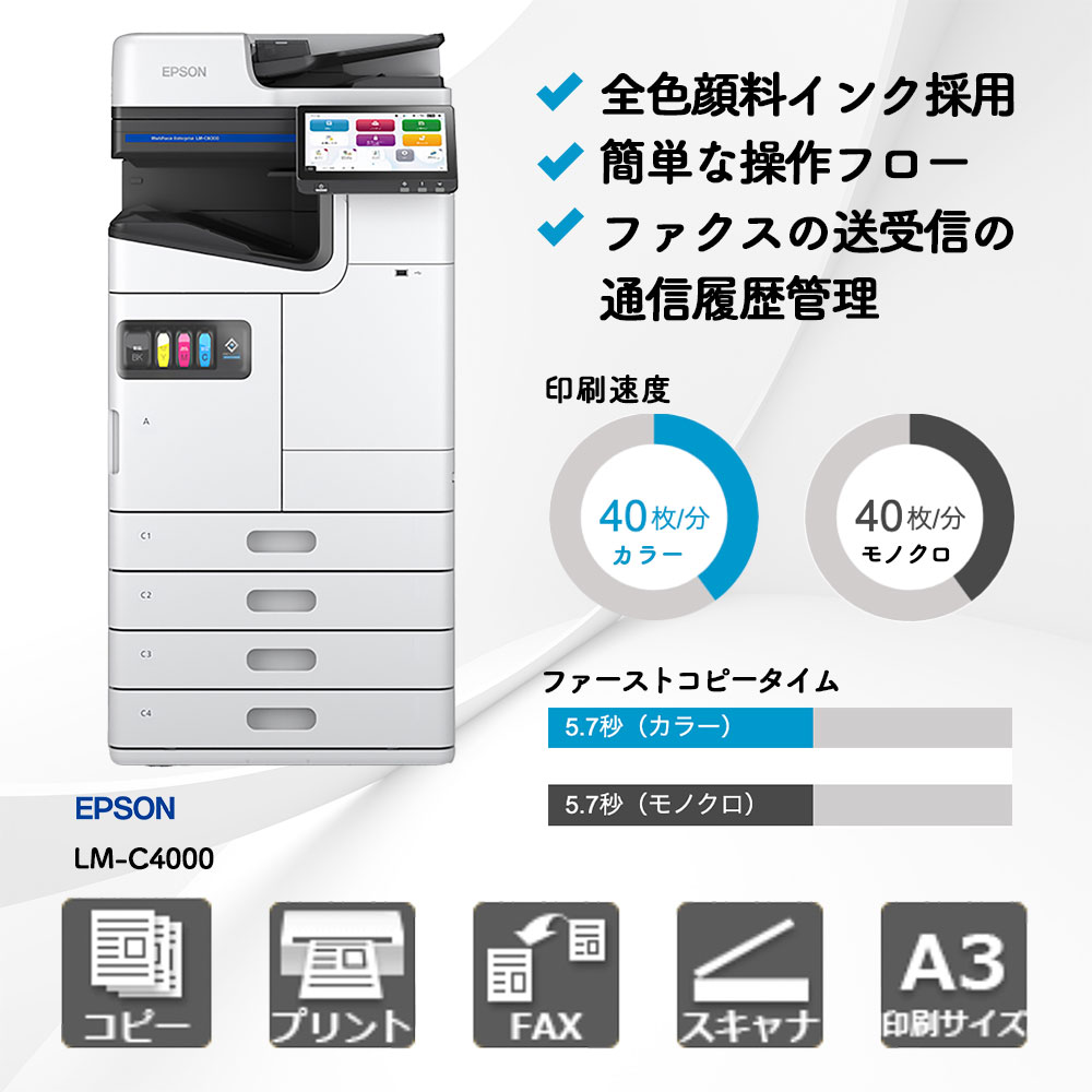 LM-C4000は、熱を使わずにインクを吐出するエプソン独自のインクジェット技術を採用した複合機です。レーザー方式に比べて消費電力が圧倒的に低く、環境負荷と毎月の電気代を大きく削減できます。また、水に濡れても滲みにくい全色顔料インクを採用しているため、ビジネス文書から厚紙のPOP印刷まで、社内の幅広い印刷ニーズを低コストでカバーできるのが強みです。